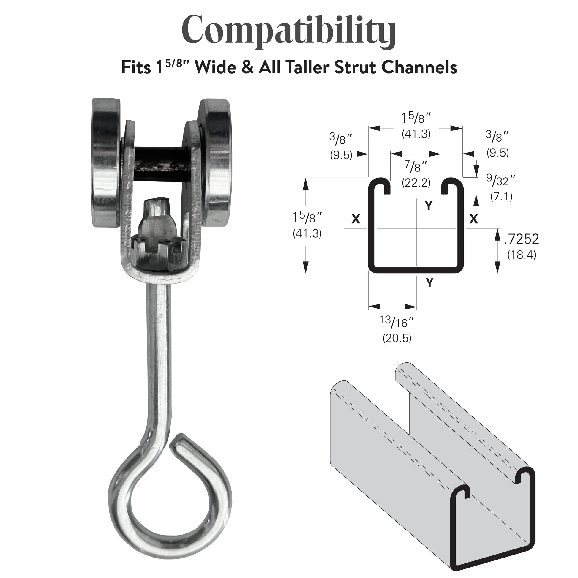 【Package Contents】Introducing Model Name: TWPS106. Includes 1 Pc of light duty 4 bearing trolley assembly. This package includes a high-quality 4 Bearing Trolley Assembly designed for use with 1-5/8" or taller strut channels. Works seamlessly with strut channel measuring 1-5/8" H x 1-5/8" W. It features a 9/16" diameter hole and a thickness of 1/4" (6mm).